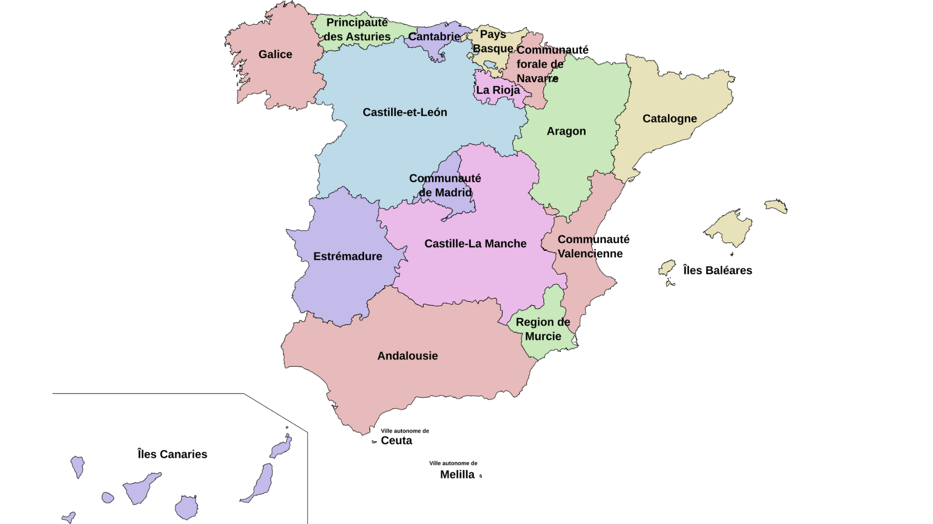 Elle est composée de 17 communautés autonomes : l'Andalousie, Aragón, les Asturies, Les Baléares, les Canaries, Cantabria; Castille et León; Castille la mancha, la Catalogne, Extremadure, la Galice, la communauté de Madrid, la Murcie, Navarre, Pays Basque, La Rioja; Communauté de Valence. Ainsi que 2 villes autonomes en Afrique du Nord : Ceuta et Melilla, limitrophes du Maroc.