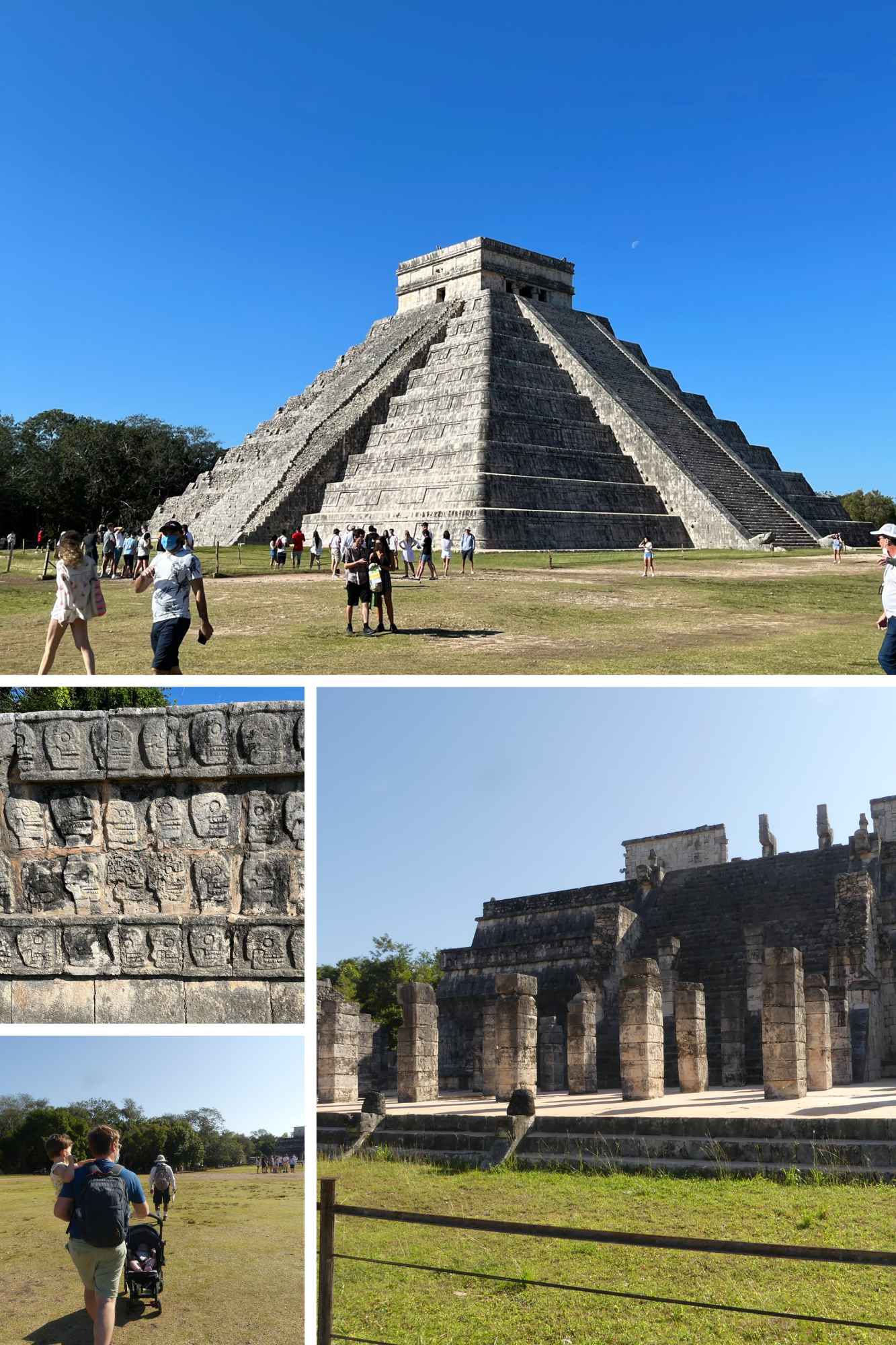 En ce jour 5, nous avions prévu de visiter le Chichen Itza avec un guide francophone. Et franchement, c'était top d'avoir pu faire cette visite en privée avec des explications en français, et que nous pouvions poser nos questions et faire des pauses quand nous en avions besoin aussi avec notre petit Luc qui buvait encore des biberons. Je vous recommande cette visite qui est, je pense, un indispensable du pays. L'ensemble du site du Chichen Itza est poussetable globalement, ce n'est une surface lisse mais c'est très correct. Je vous conseillerai encore si vous ne réservez pas de visite ne avance, ce qui permet de faire un coupe-file, de vous rendre au guichet plutôt tôt le matin pour ne pas faire trop de queue. Vous aurez aussi beaucoup de vendeurs aux alentours qui vous proposeront divers achats d'artisanat (ou des souvenirs gadgets). Le Chichen Itza est une visite qui se fait facilement même avec des petits, les espaces sont grands, vous ne vous sentez pas les uns sur les autres, c'est l'avantage.